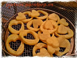 Con ayuda de lo que se conoce como un "decorador de sándwiches" , utilizando la forma de corazón, practicamos el corte en el centro de cada rodaja de patata y reservamos el corazón.