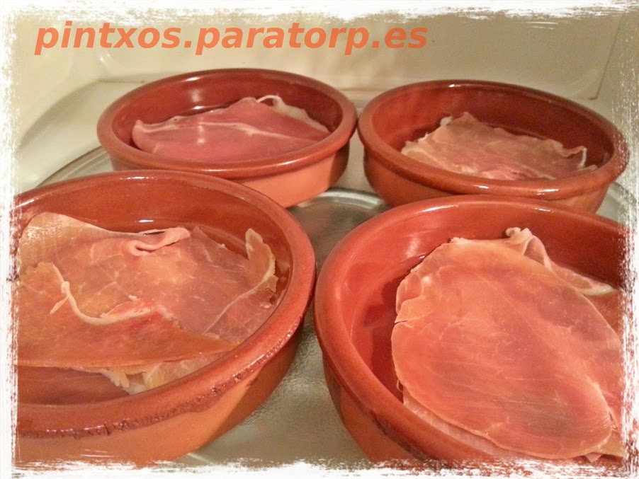 Mientras se cocinan los huevos cogemos las lonchas de ibérico y colocamos una en el fondo de una cazuelita de barro, doblándola como necesitemos para que no sobresalga.