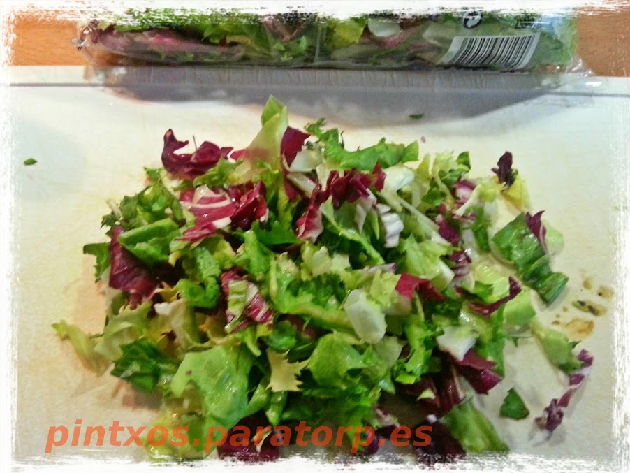 Sacamos la ensalada de la bolsa, con 1/4 parte tendremos suficiente para 8 canapés.