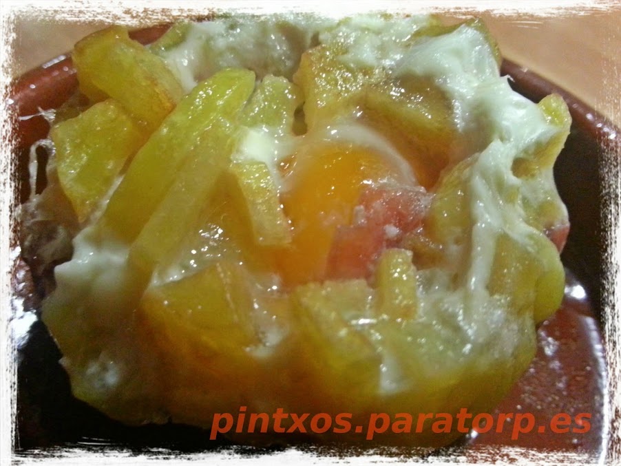 Cuánto juego dan los huevos con patatas. En esta ocasión los preparé escalfando el huevo con  patatas y  jamón serrano, quedando un masa compacta de huevo entremezclado con el resto, de una pinta excelente y llamativa. Gracias Ibon por la idea ;)